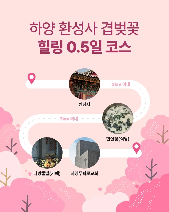 이에 경산문화관광재단은 관광객들이 주말이나 반나절을 활용해 부담없이 다녀갈 수 있는‘겹벚꽃 힐링 0.5 경산 관광 코스’로 선정했다.