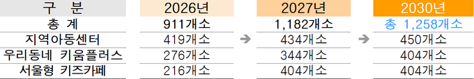 첫째, 내 집 근처에서 촘촘한 돌봄을 누릴 수 있도록 지역사회에서 아동돌봄의 큰 축을 담당하고 있는 ▴지역아동센터 ▴키움센터 ▴서울형 키즈카페를 2030년 총 1,258개소까지 단계적으로 확충하고, 기능을 강화한다.