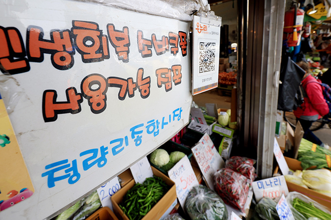 서울 동대문구 경동시장 한 점포에 '온누리 상품권과 민생회복 소비쿠폰 사용 가능' 안내문이 걸려있는 모습. 2026.4.14 (ⓒ뉴스1)
