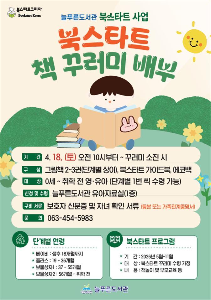 북스타트 꾸러미 신청 및 수령은 4월 18일부터 늘푸른도서관 1층 유아자료실에서 가능하며, 보호자 신분증과 자녀 확인이 가능한 등본 또는 가족관계증명서를 지참하여 현장에서 수령할 수 있다. 책꾸러미는 단계별로 생애 한 번만 수령 가능하며 중복 수령은 불가능하다.