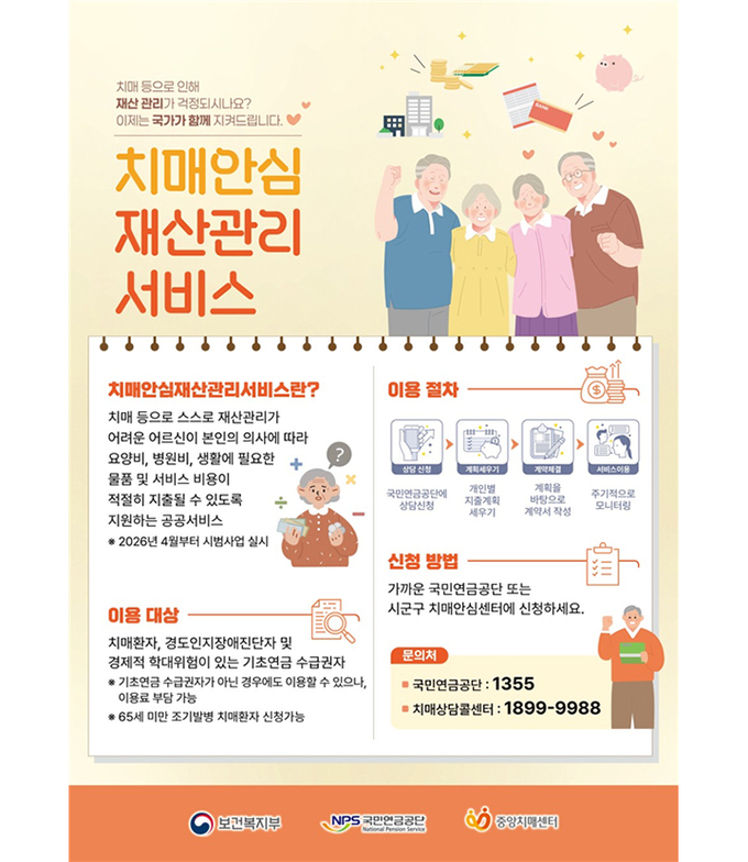 문의: 보건복지부 노인건강과(044-202-3538), 국민연금공단 재산관리지원추진단(063-713-7441) 언론홍보부(063-713-5435), 중앙치매센터 치매공공후견팀(02-6260-3161)