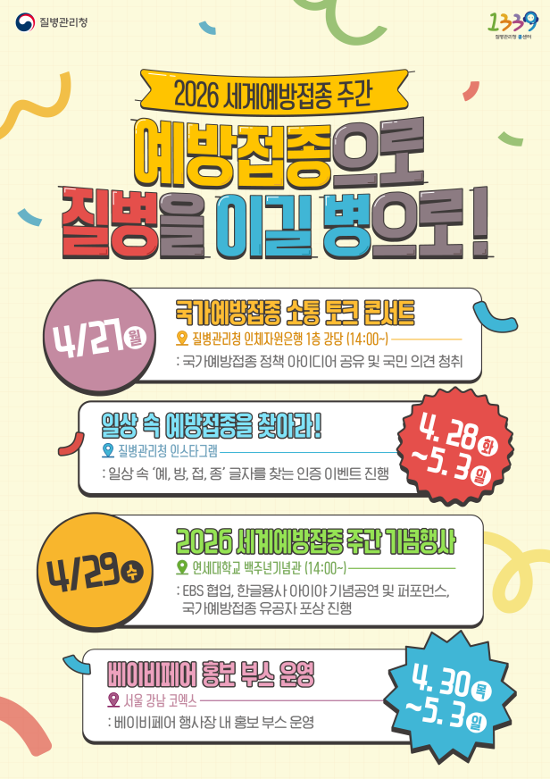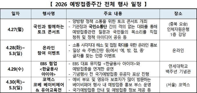 이번 「2026 예방접종주간행사」는 4월 27일(월)을 시작으로 ▲국민과 함께하는 토크 콘서트, ▲EBS 협업 어린이 공연 <한글용사 아이야>, ▲온라인 참여이벤트, ▲코엑스 베이비페어(홍보부스 운영)까지 총 4개의 행사를 통해 예방접종주간의 의미를 효과적으로 확산시킬 예정이다.