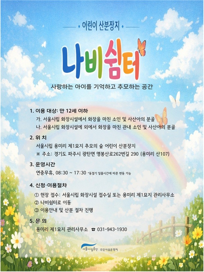 서울시는 오는 5.4.(월)부터 용미리 제1묘지(경기도 파주시 소재) 추모의 숲 안에 약 500㎡ 규모 어린이 전용 산분장지 ‘나비쉼터’ 시범 운영에 들어간다고 밝혔다.
