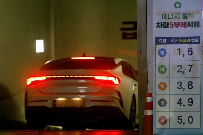 정부가 중동 상황에 따른 국제 유가 변동성 확대에 대응해 '차량 5부제 할인 특약'을 신설한 가운데 27일 서울시 종로구 세종로공영주차장에 차량 5부제 시행 안내판이 설치되어 있다.(ⓒ뉴스1)