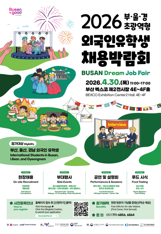[부산/문종덕기자] 부산시(시장 박형준)는 오는 4월 30일 오전 11시부터 오후 5시까지 벡스코 제2전시장(4E, 4F홀)에서 부‧울‧경 외국인 유학생을 위한 채용박람회 「BUSAN Dream Job Fair」를 개최한다고 밝혔다.
