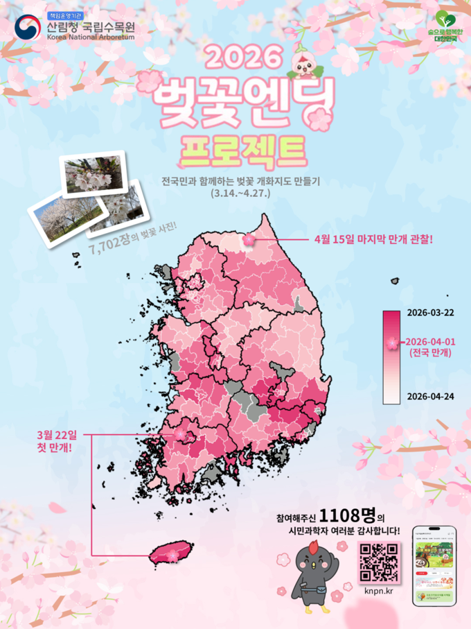 산림청 국립수목원(원장 임영석)은 2026년 봄, 시민과학 참여 프로그램 「벚꽃엔딩 프로젝트」를 통해 국민과 함께 전국 벚나무 개화 현황을 기록하고, 이를 지도 형태로 시각화한 ‘전국 벚꽃 개화지도’를 공개했다고 밝혔다.