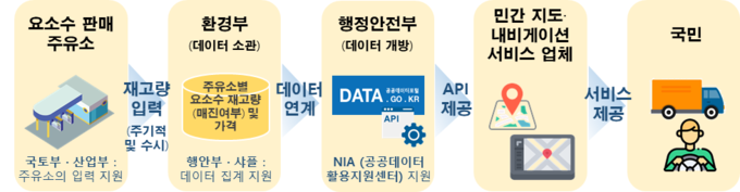 수집된 데이터는 5분마다 갱신되는 공공데이터포털 오픈API로 모든 국민과 기업에 개방 중이며, 이 API를 활용하여 민간의 주요 지도‧내비게이션 서비스*와 오피넷(Opinet) 등에서 주유소별 요소수 판매현황이 표시되고 있다.