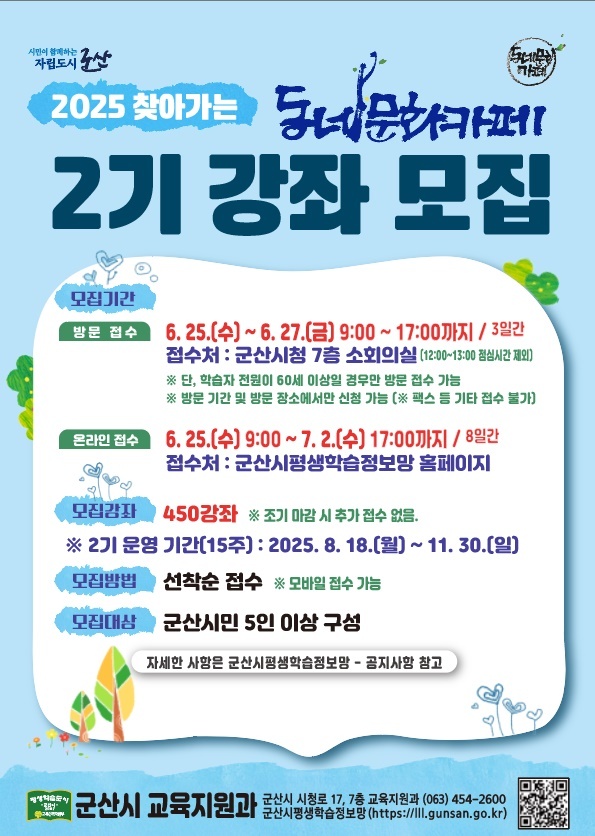 더욱 자세한 사항은 군산시 교육지원과(☎063-454~2606)로 문의하면 된다.