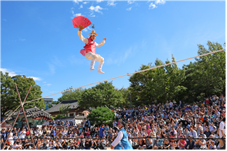 남산골한옥마을 줄타기 공연을 관람중인 시민들 |