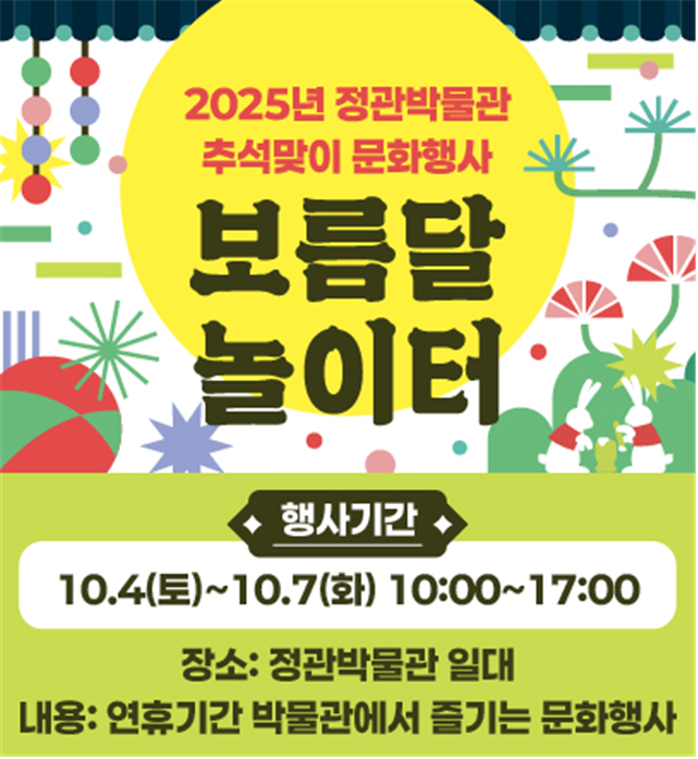 정관박물관(이하 박물관)은 다가오는 추석을 맞아 특별 문화행사 「보름달 놀이터」를 오는 10월 4일부터 10월 7일까지 개최한다고 밝혔다.