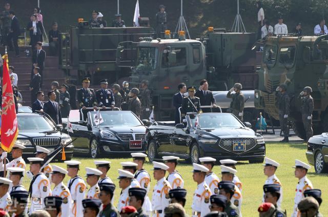 이 대통령은 이날 충남 계룡대에서 열린 제77주년 국군의날 기념사에서 "우리 국방력에 대한 높은 자부심과 굳건한 믿음에 기초해 강력한 자주국방의 길로 나아가야 한다"며 이같이 말했다.