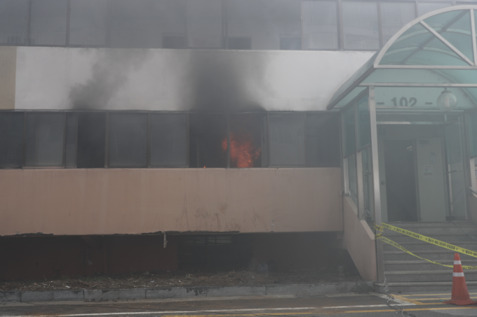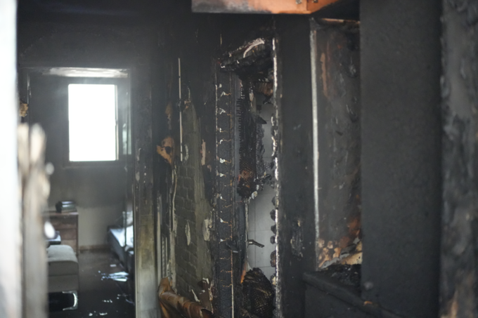 배터리 발화 후 전면 세대출입구 화염(방화문은 열폭주 등으로 훼손) |
