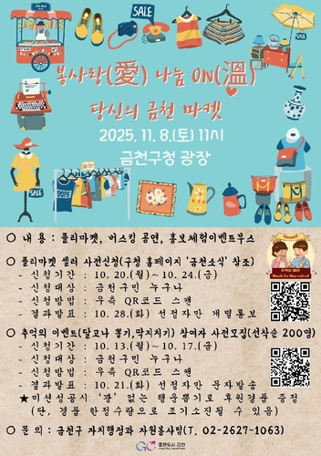 금천구(구청장 유성훈)는 오는 11월 8일 금천구청 광장 앞에서 '봉사랑(愛) 나눔ON(溫), 당신의 금천마켓'을 연다고 밝혔다.