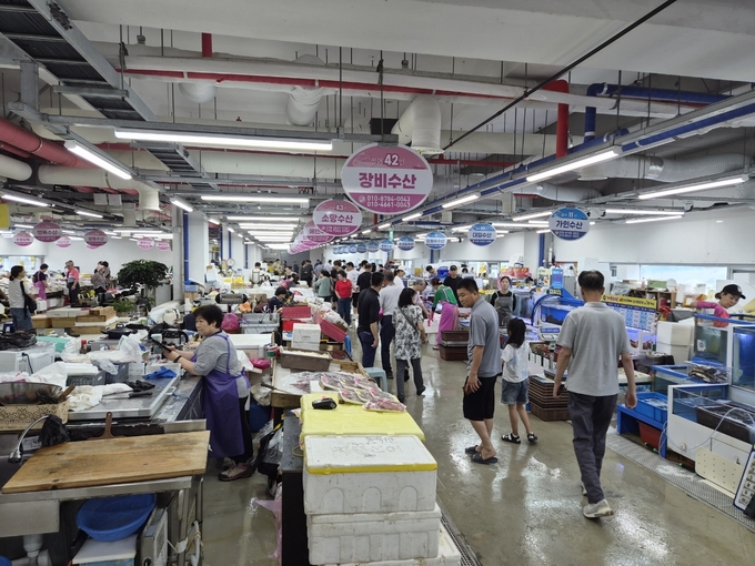 본관동 1층에는 신선한 활어와 선어, 젓갈과 같은 수산가공품이 판매되고 있으며, 2층에는 1층에서 판매하는 횟감을 떠서 먹을 수 있는 상차림 식당, 횟집 등이 있다. 건어동은 올해 10월 신축 건어 매장 준공을 앞두고 있으며, 현재는 임시 매장 25개가 다양한 종류의 건조 생선을 판매하고 있다. 영업시간은 오전 7시~오후 8시이며, 매주 화요일은 휴무이다.
