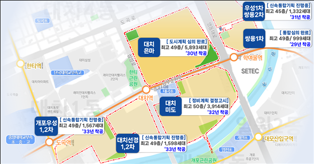 은마아파트는 2030년 착공, 2034년 준공이 목표다. 공영주차장을 설치해 대치동 학원가 상습 주차난을 해소하고, 개방형 공공도서관을 비롯해 국공립어린이집·치안센터·공원·저류시설 등 교육·복지·안전이 어우러진 주거 환경이 특징이다.