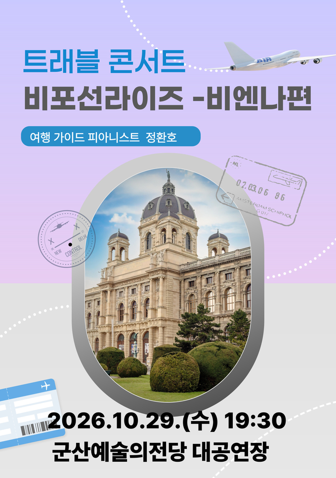 군산예술의전당의 대표 기획 프로그램인 이번 공연은 첼리스트 채훈선, 바이올리니스트 임지희가 함께 하며 피아니스트이자 해설자인 정환호가 여행가이드로 관객과 연주자·무대를 이어줄 예정이다.