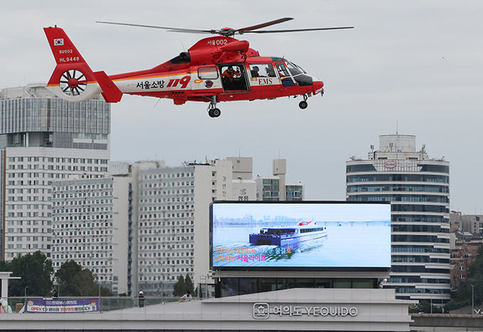 서울 영등포구 여의나루역 일대에서 열린 '2025년 서울시 재난대응 안전한국훈련'에서 소방헬기가 부상자를 이송하고 있다. 2025.9.22 (ⓒ뉴스1)