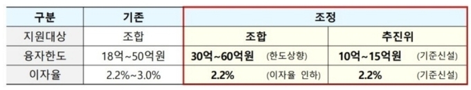 사업 초기 자금 조달에 어려움을 겪는 조합에 사업비를 저리 융자하는 초기자금 융자 상품의 지원 대상에 추진위도 추가해 확대하며 융자한도도 최대 60억 원으로 높이고 이자율도 2.2%로 인하한다.