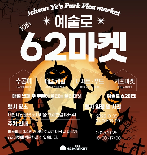 이천도자예술마을(예스파크)에서는 오는 10월 25일(토)부터 26일(일)까지, 지역 예술가와 시민이 함께 어우러지는 수공예 장터 '예술로62마켓'을 개최한다. 이번 행사는 할로윈 시즌을 맞아 "예술과 함께 즐기는 특별한 주말"을 주제로, 이천도자예술마을을 찾는 방문객들에게 다채로운 예술 체험과 즐길 거리를 선사할 예정이다.