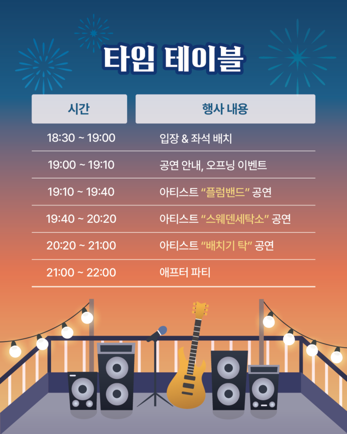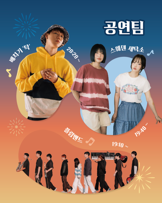 여기에 플럼밴드, 스웨덴세탁소, 배치기 등 다양한 아티스트들의 공연이 더해지며, 미니 게임, 토크쇼 등 다채로운 이벤트로 풍성한 즐길거리도 제공된다.