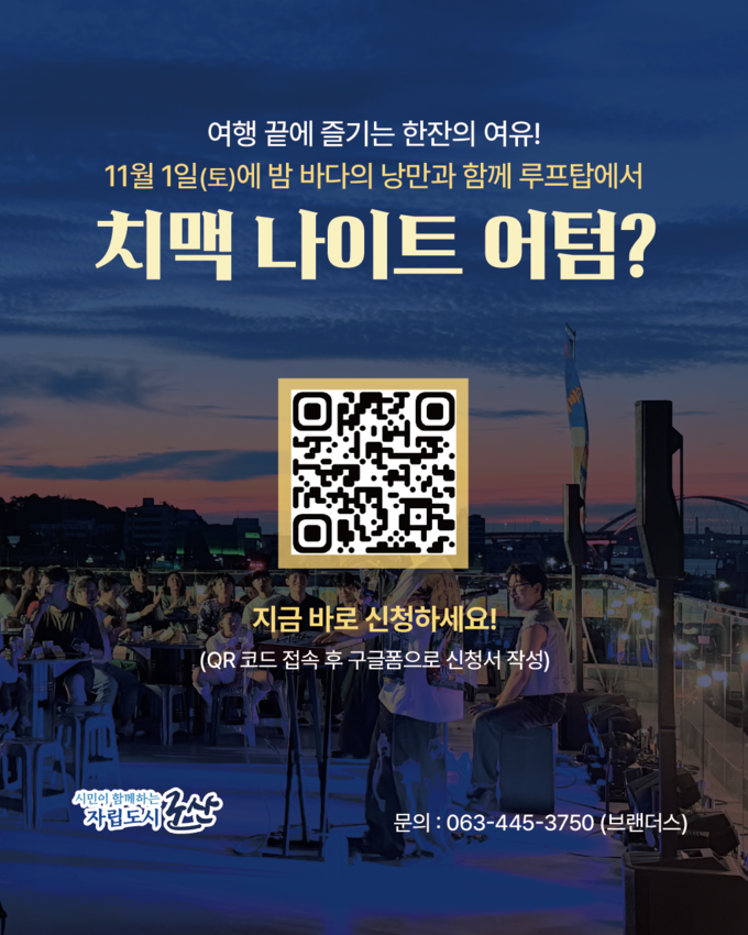 [군산/김주창기자] 깊어가는 가을밤, 군산시가 탁 트인 야외에서 즐기는 특별한 행사 ‘치맥나이트 어텀(Autumn)?’을 11월 1일 저녁 군산 내항 일원에서 개최한다.