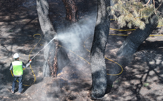 경북 안동시 임하면 개호송 숲 일부가 산불에 피해를 본 가운데 수목치료업체에서 까맣게 탄 소나무를 세척하고 있다. 2025.5.31 (사진=연합뉴스)