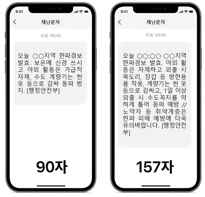 다만, 대피명령 등 긴급한 상황의 재난문자는 2019년 이전 출시된 구형 휴대전화의 경우 157자 수신이 불가능한 점을 고려해 기존 90자 체계를 유지한다.