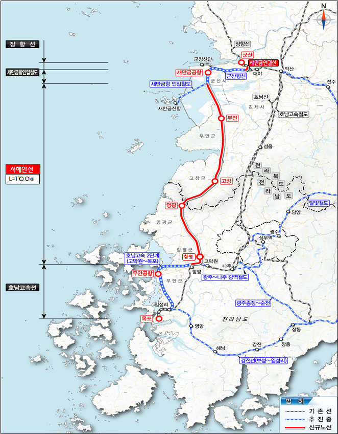 서해안철도 노선은 총 연장 110km, 총사업비 4조 7919억원 규모로, 서해선(서화성~홍성)과 장항선(홍성~군산), 새만금선(군산~새만금)을 잇는 서해안 철도축의 마지막 단절구간을 메우는 핵심 구간이다.