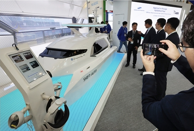 지난달 21일 부산 해운대구 벡스코 제1전시장에서 열린 '2025 국제조선 및 해양산업전'에서 관람객들이 삼성중공업 부스에 전시된 삼성 스마트싱스를 탑재한 자율운항 실증 선박 '시프트-오토'(SHIFT-Auto)를 살펴보고 있다.(사진=연합뉴스)