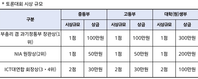 토론대회 우승팀에게는 부총리 겸 과기정통부장관상과 함께 100~300만원의 상금이 수여되었으며 준결승 진출팀까지 총 1,120만원의 상금*이 제공되었다. 논문대회 최우수작에게 부총리 겸 과기정통부장관상 장관상과 300만원의 상금이 수여되었고 우수작에도 각각 200만원 씩 수여되어 총 700만원이 논문대회 상금으로 돌아갔다.