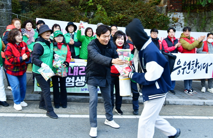 올해 관내 고등학교 6개 시험장에서 2,207명의 수험생이 응시했으며, 이날 시험장 앞에서는 학부모회, 청소년 선도위원회, 지역 봉사단체에서 추운 날씨 속 수험생과 학부모를 위해 따뜻한 음료와 간식을 제공하며 훈훈한 모습을 보였다.