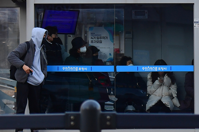 13일 오전 경북 포항시 남구 시외버스터미널 앞 스마트 승강장 쉼터에서 출근길에 나선 시민들이 잠시 추위를 피하고 있다. (ⓒ뉴스1)