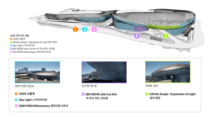 마지막으로 서울시 홍보대사로도 활동 중인 ‘엔하이픈’ 데뷔 5주년 ‘엔하이픈 애니버서리(ENHYPEN ENniversary)’가 네 번째 테마다. 엔하이픈의 뮤직 라이트 콘텐츠 ‘폴라로이드 러브’는 DDP 222m 외관을 따라 조명과 레이저가 음악에 맞춰 색상을 바꾸는 방식으로 마치 공연을 보고 있는 듯한 느낌을 선사한다.