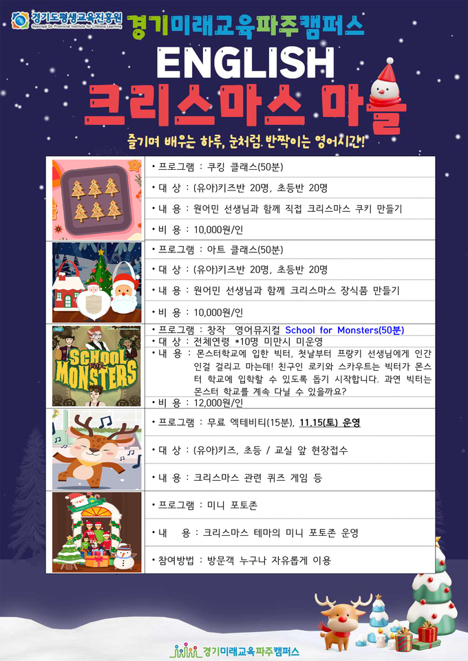 [경기/김명성기자] 경기도평생교육진흥원 경기미래교육파주캠퍼스(구 파주영어마을)가 다가오는 크리스마스를 맞아 어린이들의 글로벌 감각을 키울 수 있는 특별 영어체험 프로그램을 운영한다.