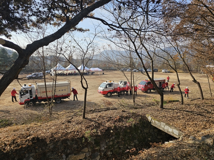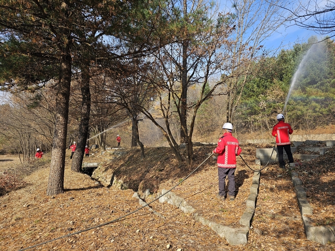 공중에서는 산불임차 헬기 1대와 드론을 활용한 소화탄을 시연해 산불 현장의 공중지원 능력을 높이는 훈련으로 이뤄졌다.