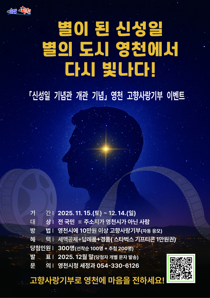 영천시(시장 최기문)는 신성일 기념관의 정식 개관을 기념해, 11월 15일부터 12월 14일까지 한 달간 ‘고향사랑기부 특별 이벤트’를 진행한다고 밝혔다.