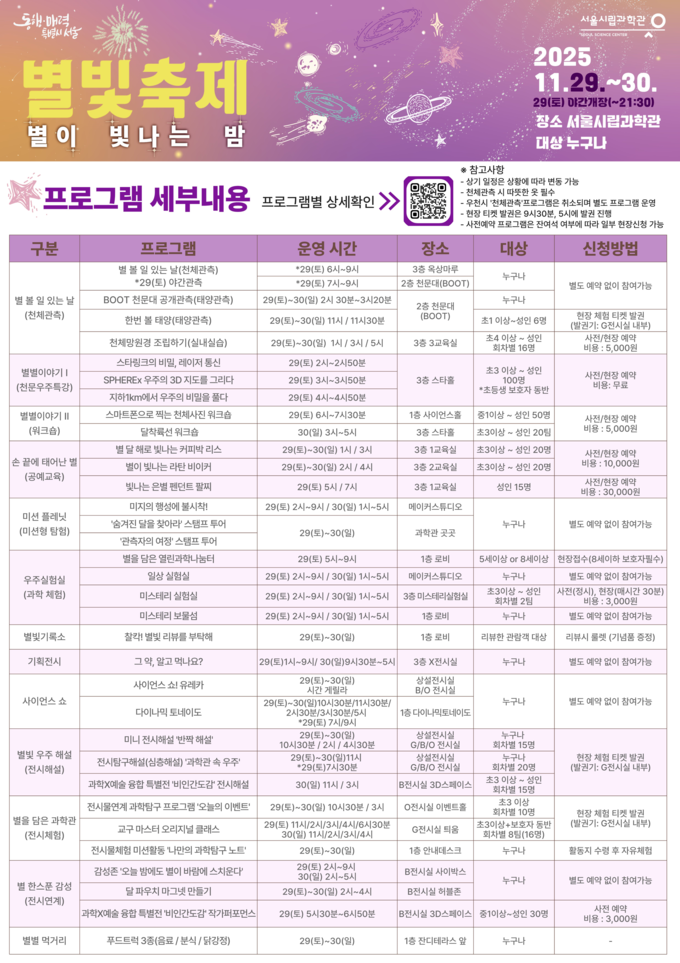 축제는 서울시립과학관 실내·야외 전역에서 진행되며, 시민 누구나 자유롭게 참여할 수 있다. 특히 29일(토)에는 저녁 9시 30분까지 과학관 전체를 야간개장해 천체관측회, 강연, 체험교육, 워크숍 등 다양한 프로그램을 선보이며, 가을밤에 어울리는 특별한 관람 경험을 제공한다.
