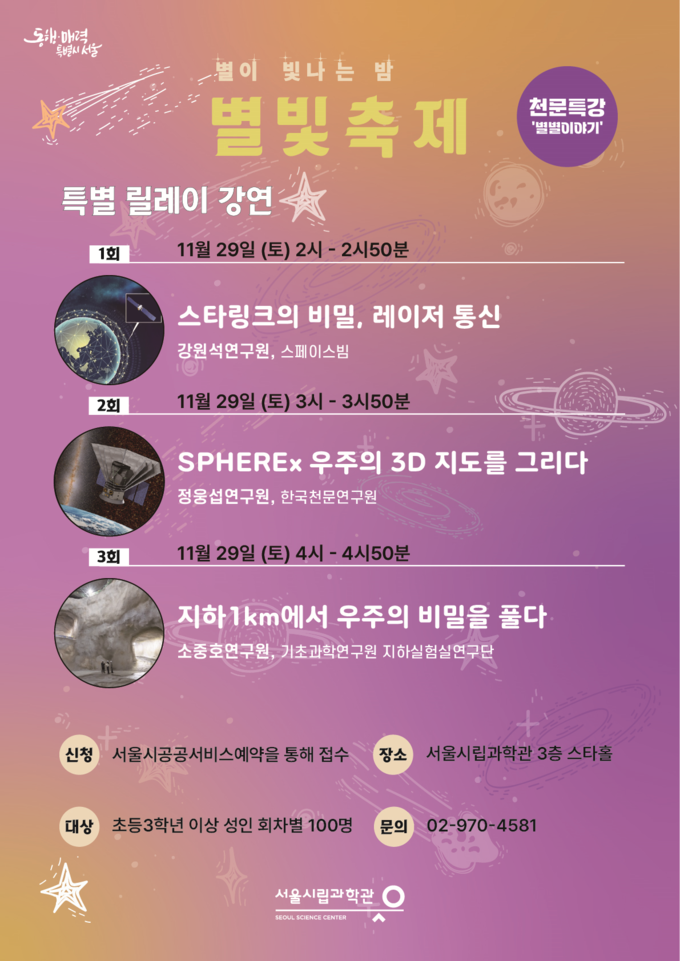 서울시립과학관은 오는 11월 29일(토)부터 30일(일)까지 ‘2025 별빛축제–별이 빛나는 밤’을 개최하고, 가을 밤하늘의 대표 천체를 시민 누구나 체험할 수 있는 천체관측회와 전문가 강연, 과학문화 프로그램을 전 관람객에게 선보인다고 밝혔다.