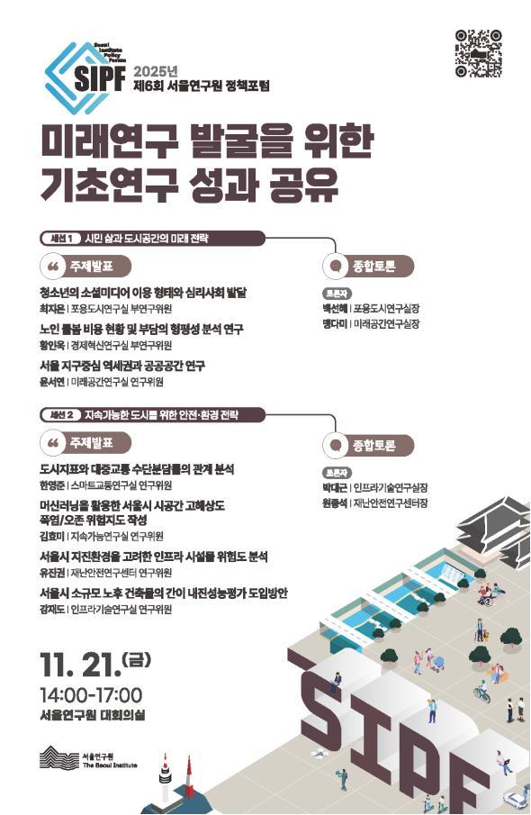 [서울/박기문기자] 서울연구원(원장 오균)은 11월 21일(금) 오후 2시, 서울연구원 대회의실에서 ‘미래연구 발굴을 위한 기초연구 성과 공유’를 주제로 「2025년 제6회 서울연구원 정책포럼」을 개최한다. 이번 포럼에서는 서울연구원이 추진한 기초연구의 주요 성과를 점검하고 미래도시의 전략적 정책과제와 연계할 수 있는 연구 방향을 모색한다.