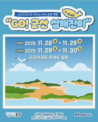 ‘GO! 군산 섬해진미’는 군산에서 처음으로 선보였으며, 고군산군도의 바다·식재료·어촌문화를 깊이 이해할 수 있도록 기획된 1박 2일 체류형 미식관광 체험 프로그램이다.