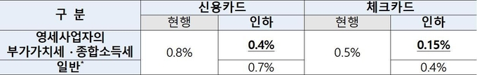 영세사업자의 사업·생계와 밀접한 세목인 부가가치세·종합소득세에 대하여는 신용카드 납부 시 0.4%p, 체크카드 납부 시 0.35%p를 인하하여, 신용카드 기준 50% 인하된 수수료율을 적용하게 됩니다.