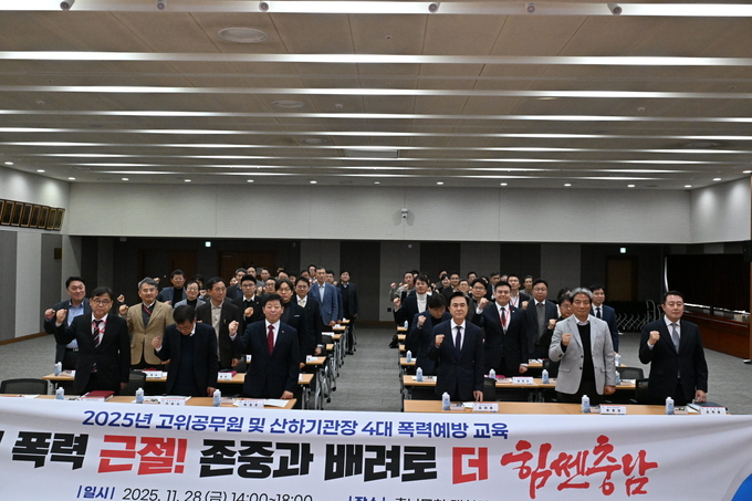 [충남/오창환기자] 충남도는 28일 도청 대회의실에서 ‘2025년 고위 공무원·산하 기관장 4대 폭력 예방 교육’을 진행했다.