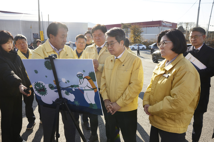 김 지사는 현장에서 터널식 소독조에서 진행되는 가축 방역 과정을 지켜본 후 관계자들을 격려하고 겨울철 동물방역에 최선을 다해줄 것을 당부했다.