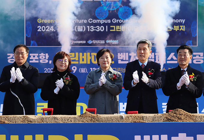 송미령 농림축산식품부 장관이 9일 오후 경북 포항에서 열린 그린바이오 벤처 캠퍼스 착공식에 참석해 기념촬영을 하고 있다. (농식품부 제공) 2024.12.9 (ⓒ뉴스1)