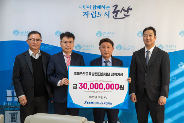 [군산/김주창기자] 군산시는 ㈜삼일씨엔에스(유청무 대표 외 2명)가 군산교육발전진흥재단에 장학금 3천만 원을 기탁했다고 4일 밝혔다.