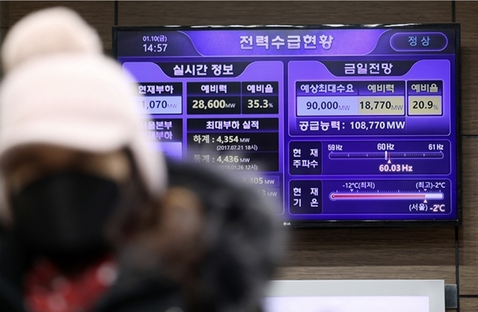 서울 중구 한국전력 서울본부 모니터에 실시간 전력수급현황이 표시되는 모습. 2025.1.10 (ⓒ뉴스1)