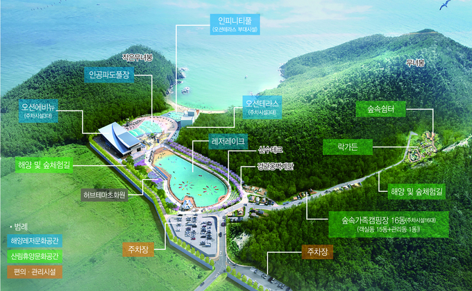 64,365㎡ 규모로 조성 중인 복합단지는 ▲서핑·잠수 등 해양스포츠를 즐길 수 있는 ‘오션에비뉴’, ▲샤워실·푸드코트 등 편의시설을 갖춘 ‘오션테라스’, ▲몽돌해변 전망을 즐기는 ‘인피니티풀’, ▲최대 3m 인공 파도를 구현한 ‘파도풀’, ▲카누·카약 체험이 가능한 ‘레저레이크’, ▲휴식과 체류 가능한 ‘숲속 캠핑장’ 등 다채로운 공간으로 구성된다.