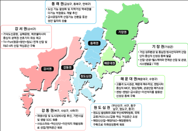 2040 부산도시기본계획상 ▲‘대생활권’은 서·중·동부산권으로 ▲그 아래 ‘중생활권’은 강서·강동·동래·원도심·기장·해운대권으로 나뉜다.