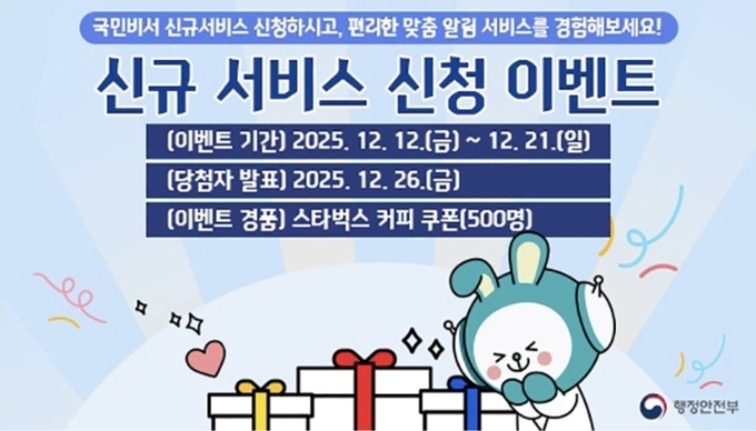 한편 행안부는 서비스 확대를 기념해 오는 12일부터 21일까지 국민비서 신규 알림 서비스 신청자를 대상으로 이벤트를 진행하는 바, 총 500명을 추첨해 모바일 기프티콘을 제공할 예정이다.
