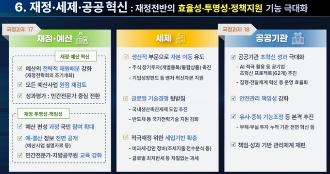 공공기관 혁신도 강화해 공기업 초혁신 프로젝트를 통해 디지털 전환과 자동화를 확대하고, 중대재해 발생 시 기관장 해임이 가능하도록 법적 근거를 명확히 하는 한편, 유사·중복 기능 조정과 통폐합 등 구조개혁도 추진한다.